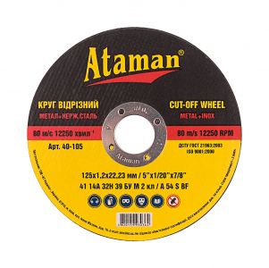 Круги відрізні по металу Ataman 41 14А 125х1.2х22.23 Круги відрізні по металу Ataman 41 14А 125х1.2х22.23