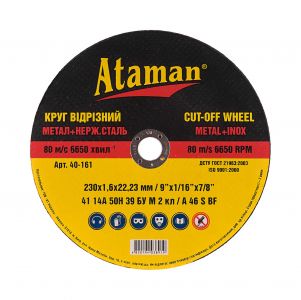 Круги відрізні по металу Ataman 41 14А 230х1.6х22.23 Круги відрізні по металу Ataman 41 14А 230х1.6х22.23