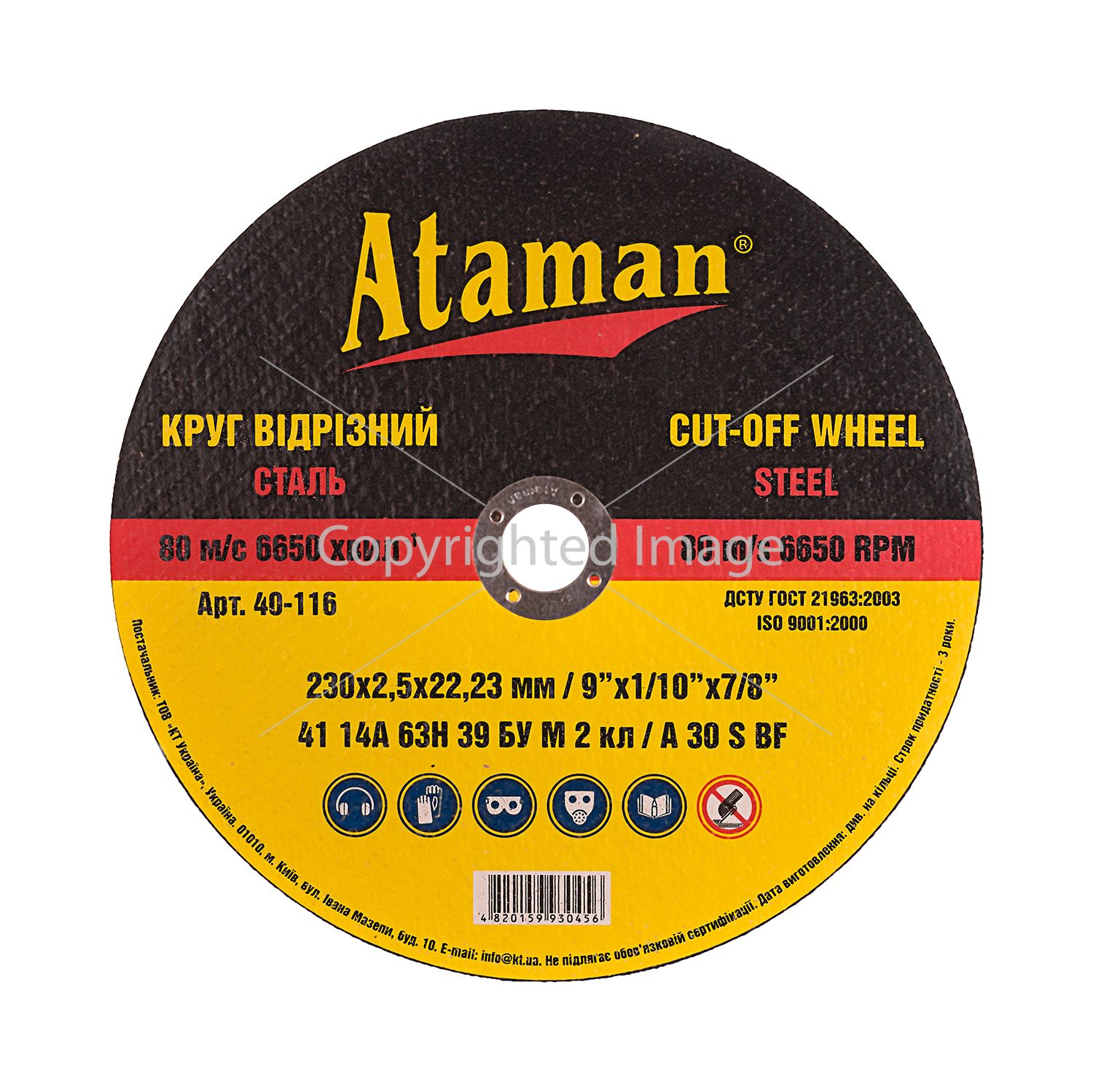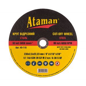 Круги відрізні по металу Ataman 41 14А 230х2.5х22.23 Круги відрізні по металу Ataman 41 14А 230х2.5х22.23