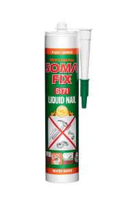 Рідкі цвяхи Soma Fix - багатофункціональний еластичний продукт, який не має запаху, застосовується в монтажі і склеюванні гіпсокартону, кераміки, лінолеуму, паркету, цегельного облицювання, виробів із пластику, металу, ДСП і т.д. Продукт зручний в застосуванні, забезпечує високу міцність і надійність проведених робіт, економлячи при цьому час.