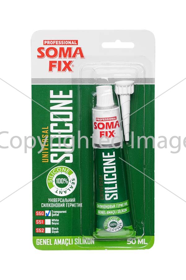 Універсальний силіконовий герметик Soma Fix - зручний в застосуванні матеріал, широко застосовується у внутрішніх і зовнішніх роботах, пов'язаних з герметизацією віконних рам, дверей, сантехнічних систем, ущільненням будівельних конструкцій і т.д. Низька усадка і чудова стійкість до зовнішніх умов (температура, вода, УФ випромінювання) забезпечує максимальну надійність і довговічність проведених робіт.