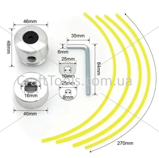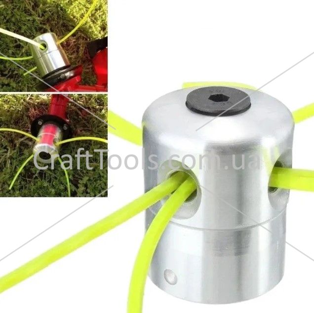 Універсальна косильна головка підходить для всіх видів мотокос, бензокос, електротриммерів, триммерів, а також для газонокосарок де можна встановити косильний диск або ніж. Виготовлена із якісного шліфованого алюмінію. Не створює навантаження на вал і двигун оберігаючи цим знос вашого інструменту. Стійка до механічних ушкоджень під час роботи.